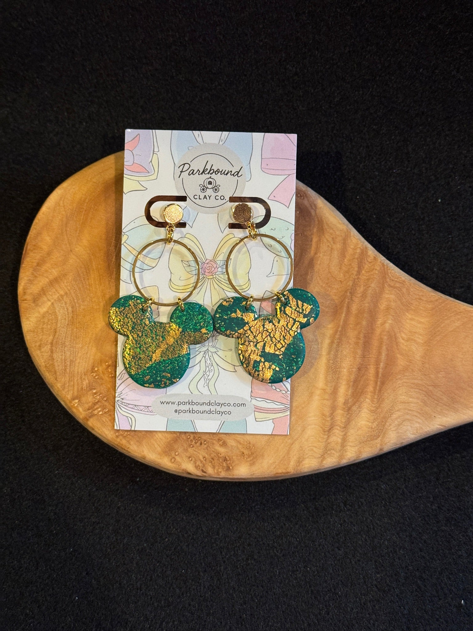 Emerald Magic Mouse Earrings | Green & Gold Foil Dangle Hoops | Handmade Polymer Clay Disney-Inspired Jewelry