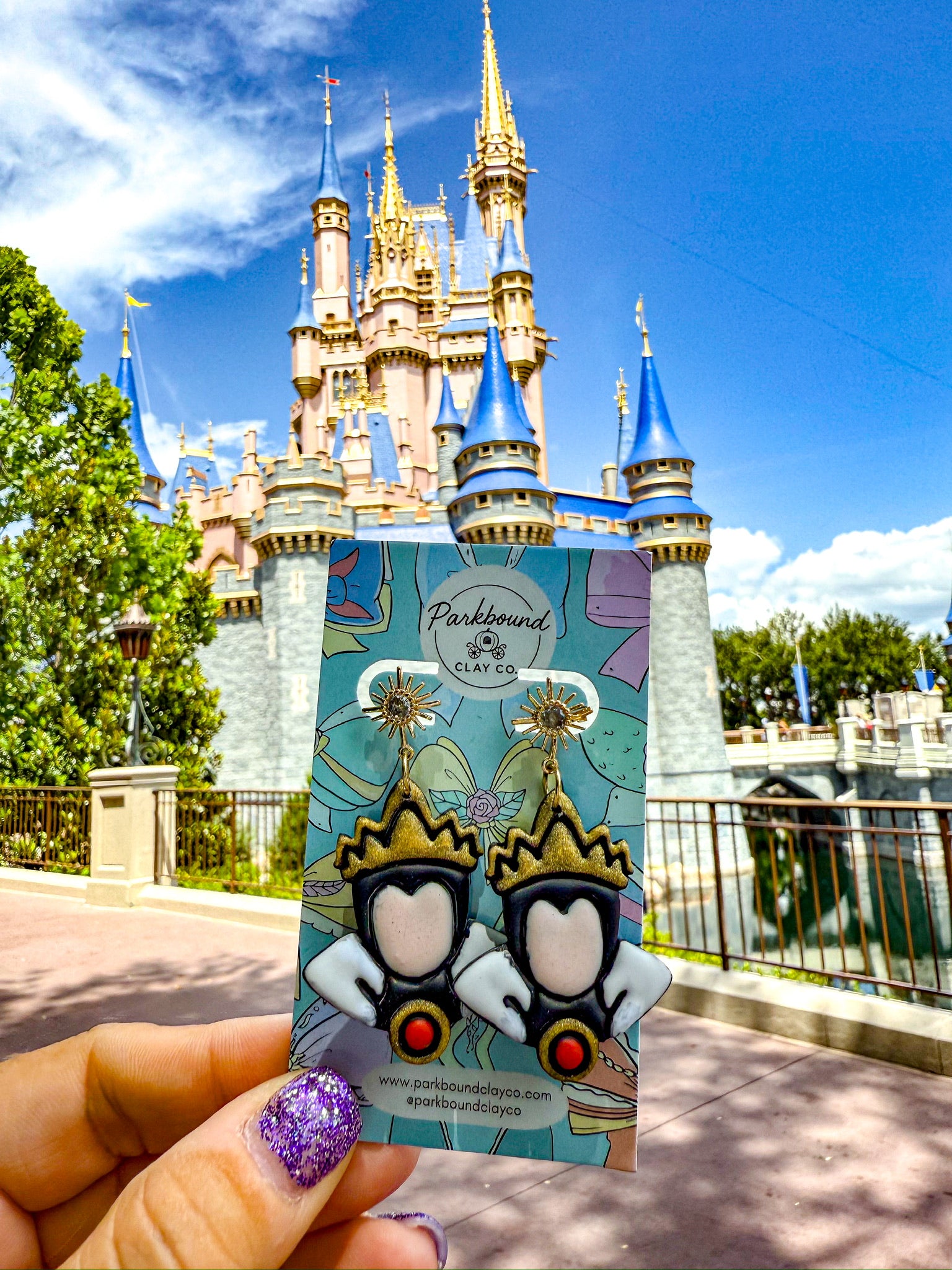 Handcrafted with shimmering black and gold details, these earrings capture the signature look of the Evil Queen—complete with her regal crown, iconic collar, and bold red jewel. The perfect finishing touch to your villainous outfit, Halloween look, or anytime you’re feeling a little extra wicked.