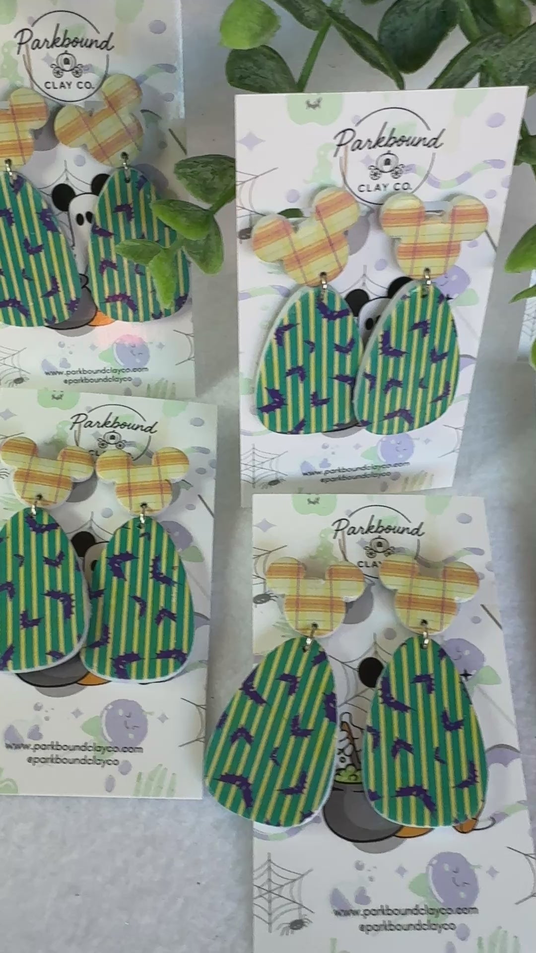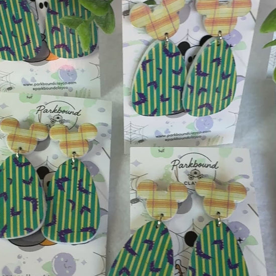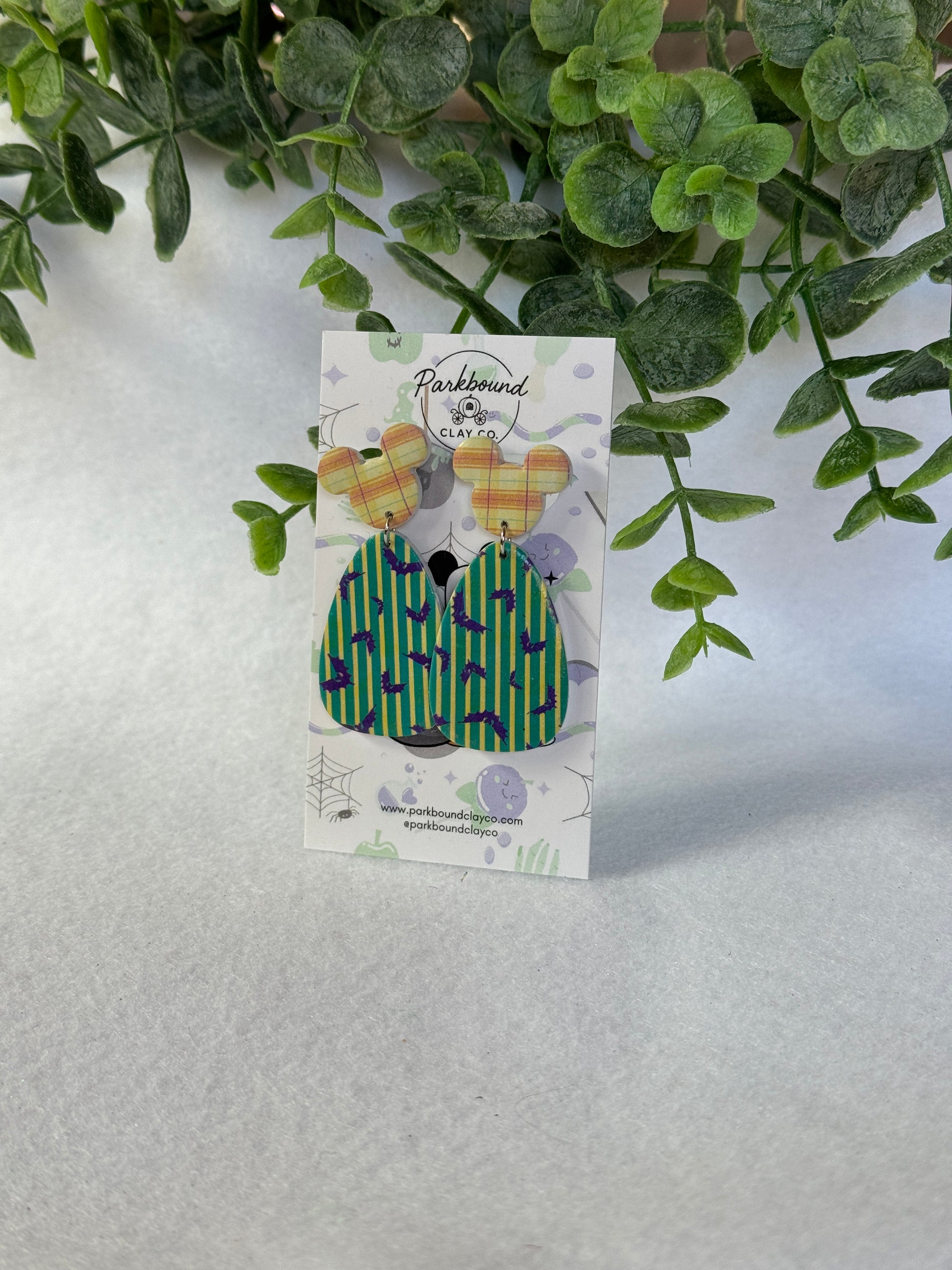 The design features a plaid Mickey-shaped topper paired with bold green and blue striped dangles accented with tiny purple bats. Lightweight and comfortable.