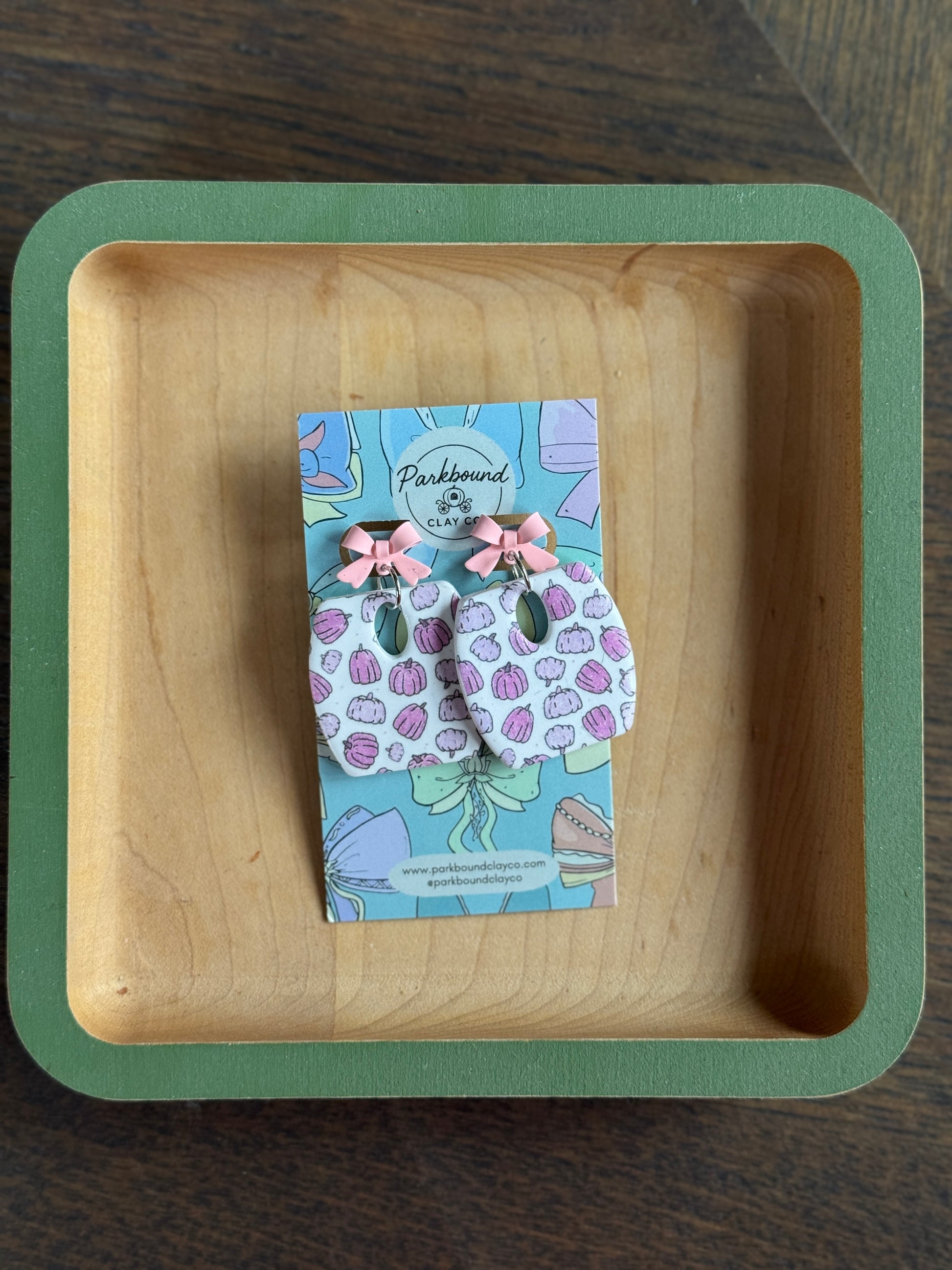 handcrafted polymer clay earrings featuring a delicate pink pumpkin pattern and pastel bow studs. These statement earrings blend seasonal charm with meaningful awareness for Breast Cancer Awareness Month.