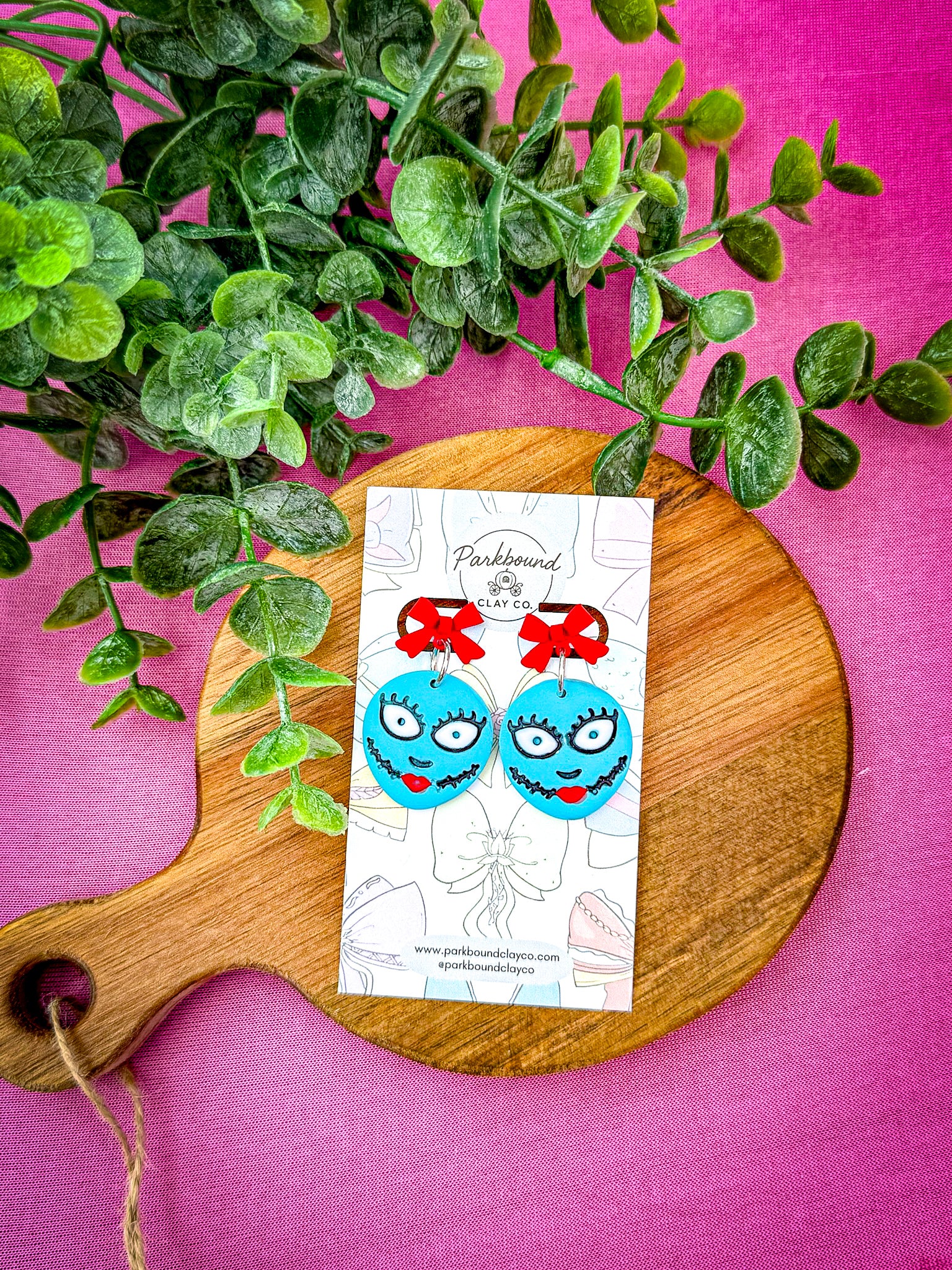 💙✨ Inspired by everyone’s favorite patchwork sweetheart, these Sally-Inspired Earrings are perfect for fans of spooky season and whimsical style! Handcrafted from polymer clay, each earring features Sally’s iconic stitched smile, wide eyes, and a festive red bow for that touch of Halloween magic.