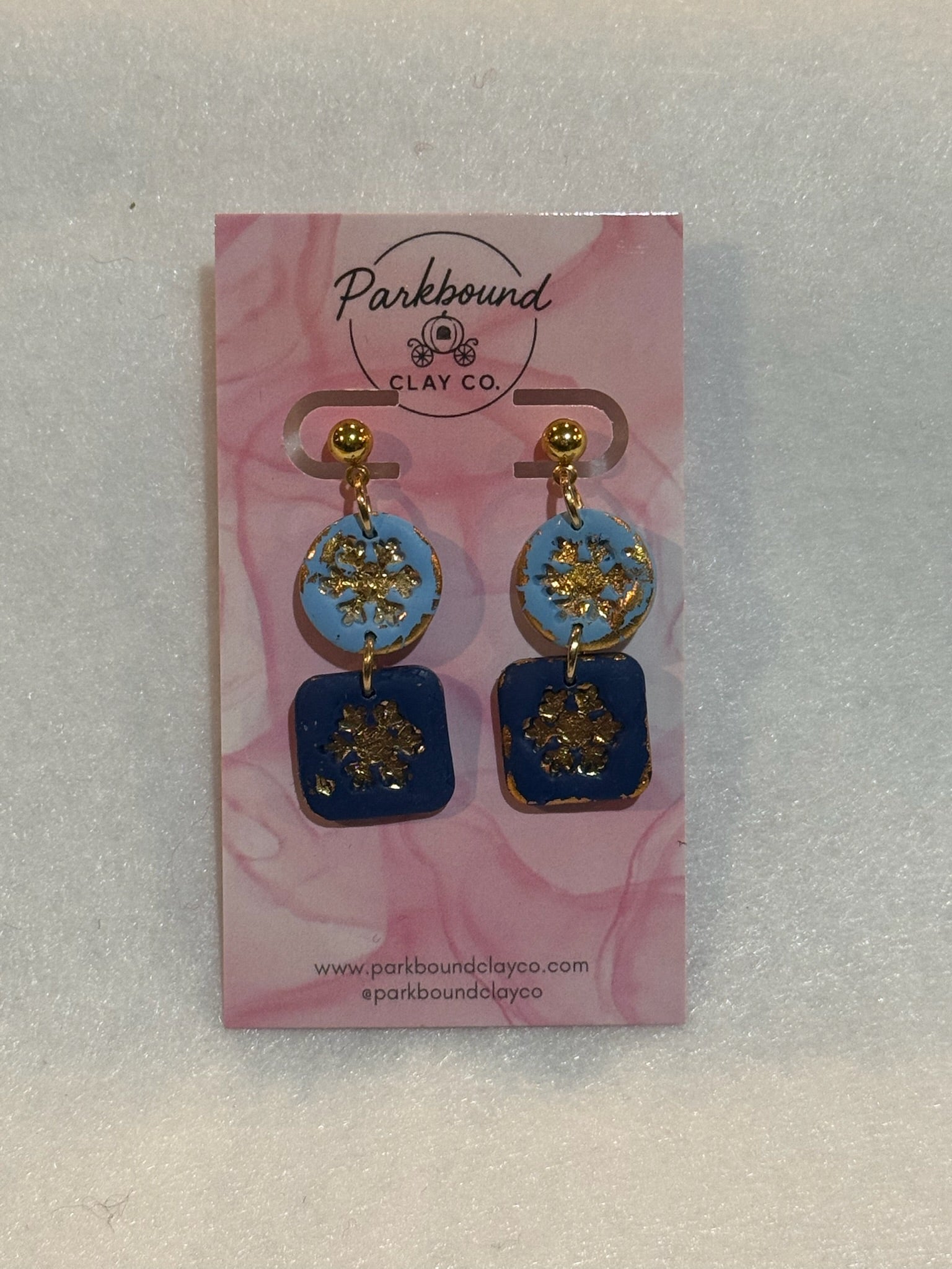 winter jewelry, snowflake dangles, blue polymer clay, gold accent jewelry, winter statement jewelry, handmade clay jewelry, lightweight dangles, holiday accessories, winter gift idea, blue and gold jewelry, park inspired style, geometric dangles, seasonal jewelry